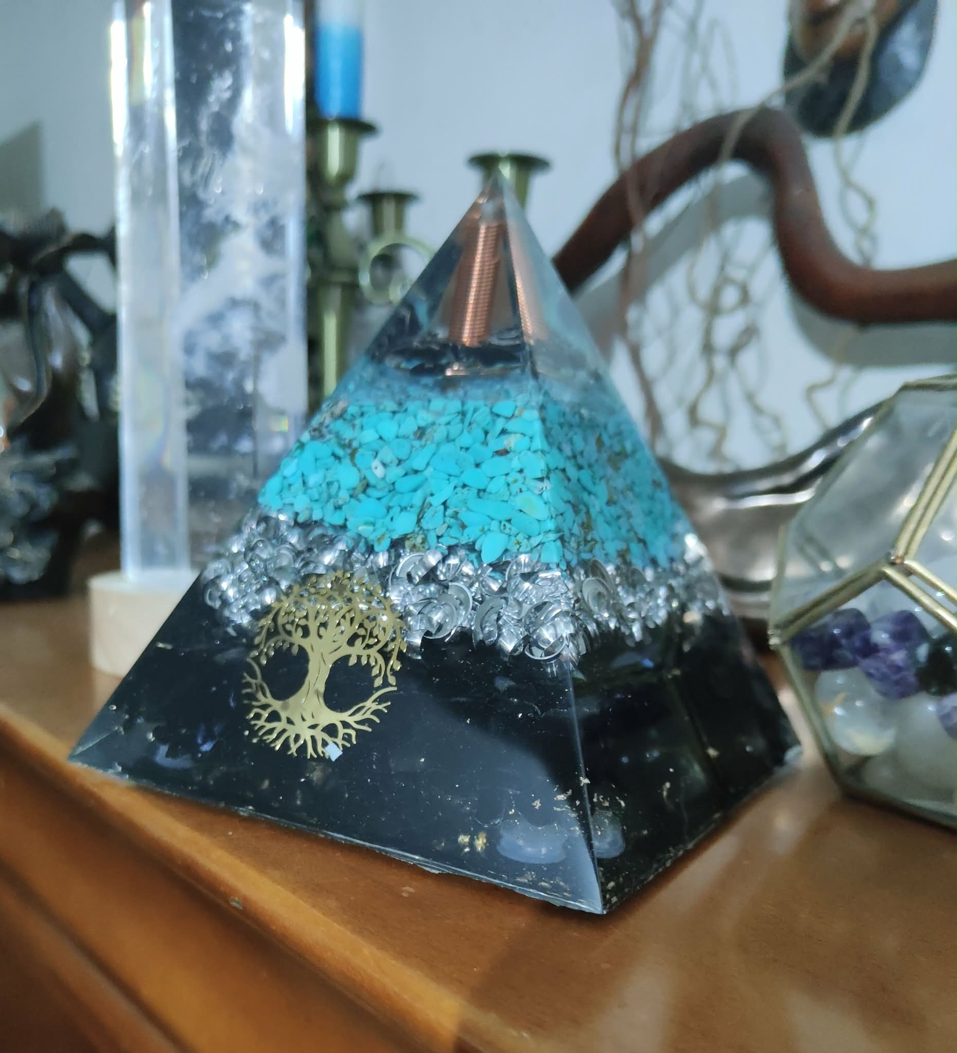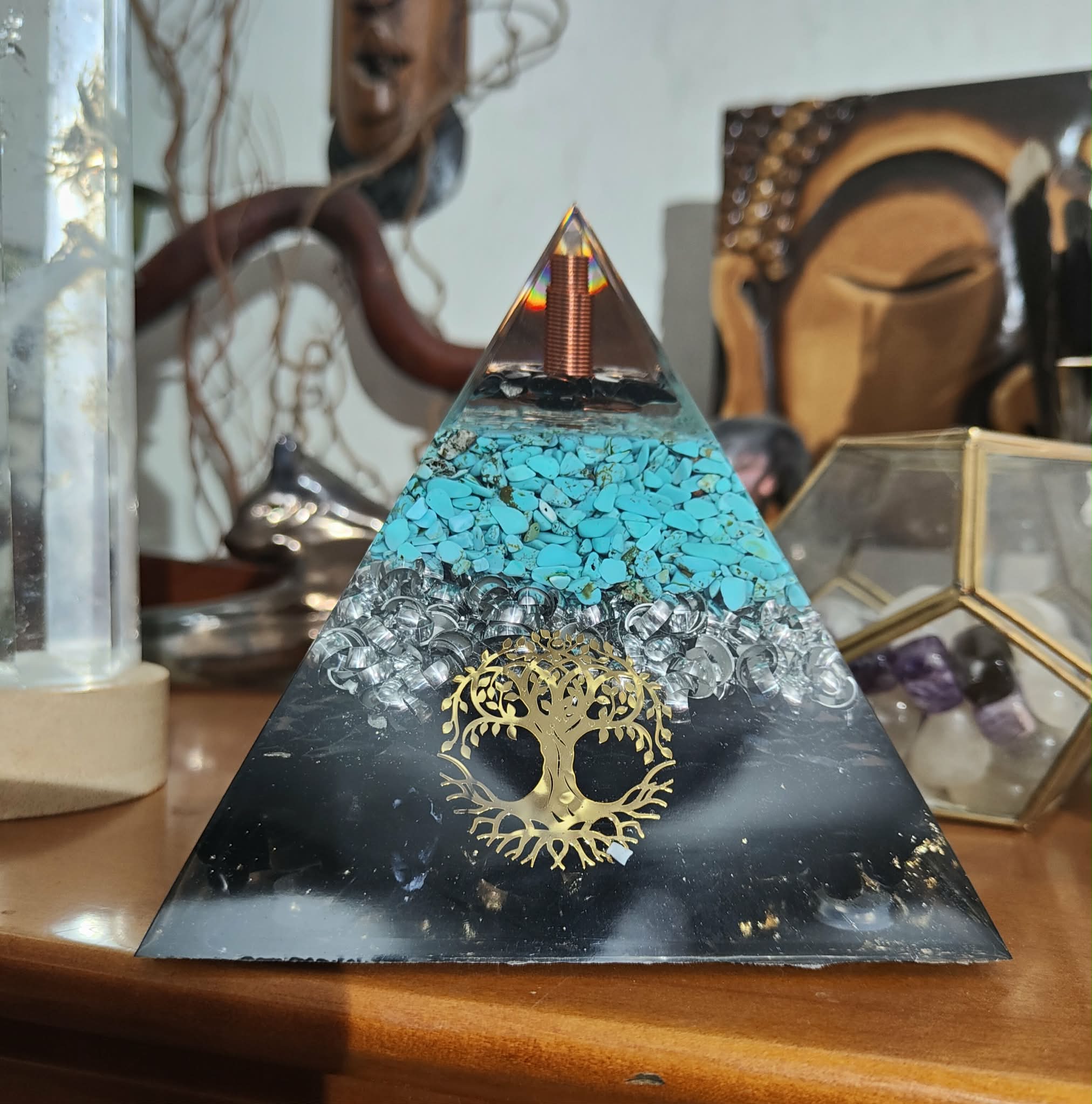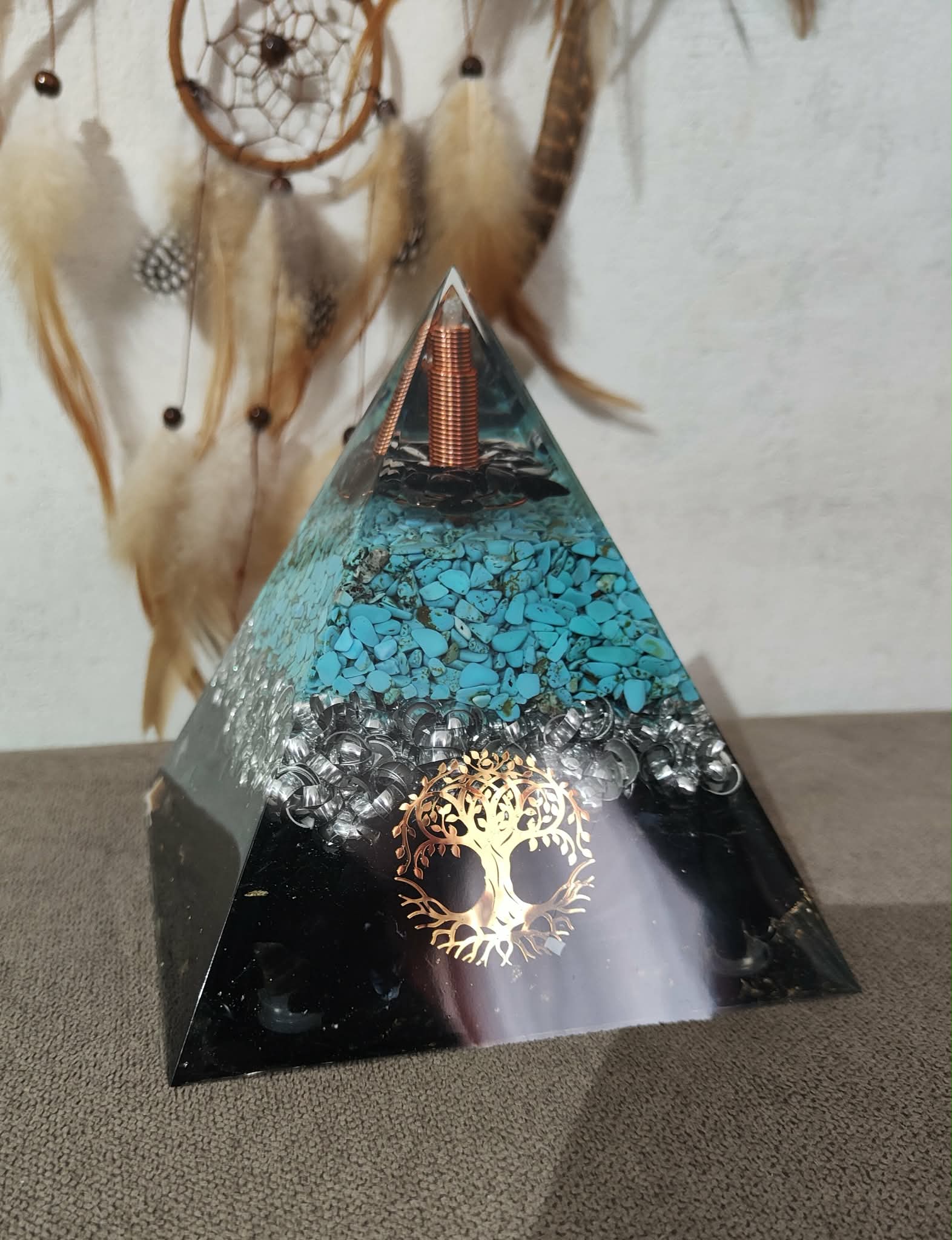 Le puissant mélange de la shungite et de l'Obsidienne, mêlée à de la turquoise. La pointe en cristal de roche sur le sommet est présente afin de multiplier et rassembler les effets de la pyramide vers le haut.