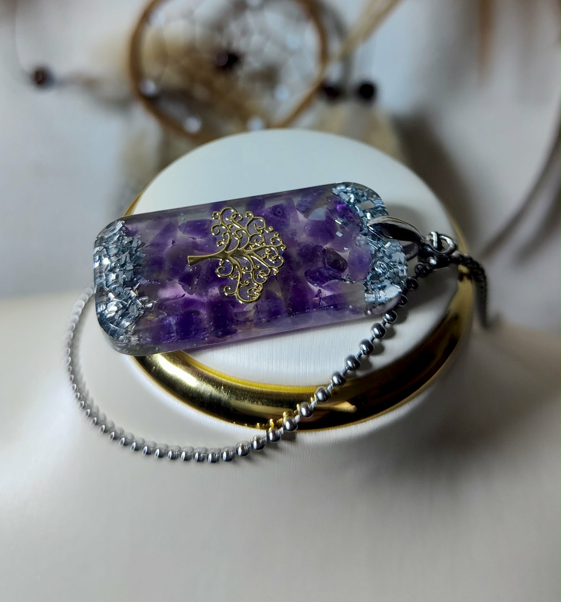 Matériaux: Résine, AMÉTHYSTE, aluminium, paillettes et cuivre.